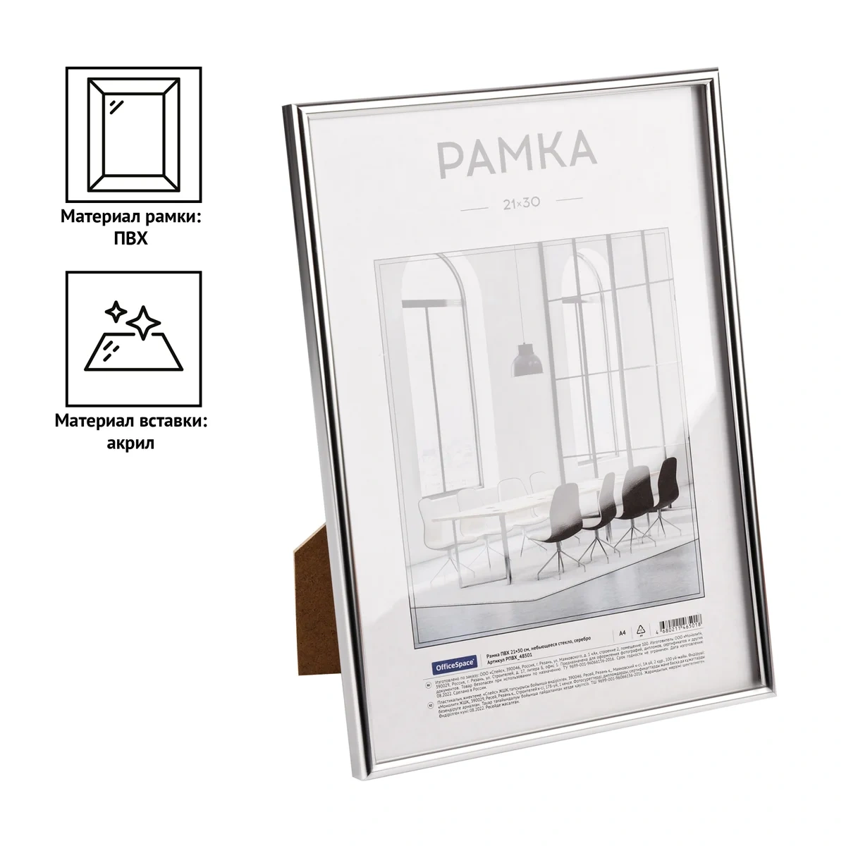 Рамка OfficeSpace подчеркнет стиль интерьера и сохранит важные моменты. Подходит как для вертикального, так и для горизонтального использования. Рамка размером 21*30 см изготовлена из серебристого ПВХ. Оборотная сторона изготовлена из оргалита, усиленная фурнитура, небьющееся стекло. Предусмотрена ножка для использования на горизонтальных поверхностях.