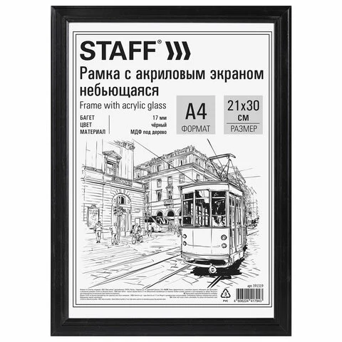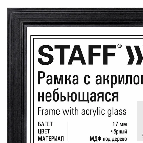Рамка 21х30 см небьющаяся, багет 17 мм МДФ под дерево, STAFF 'Carven', черная, 391319