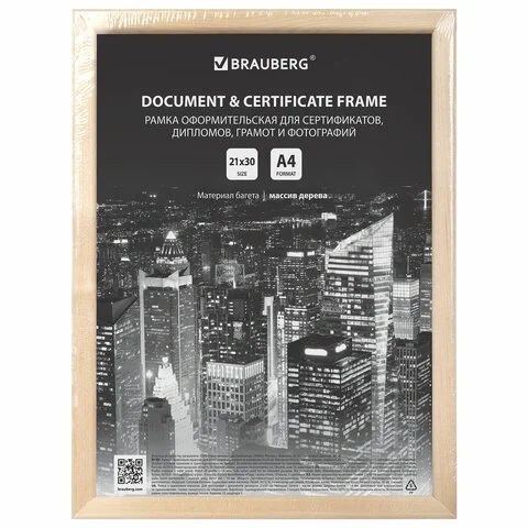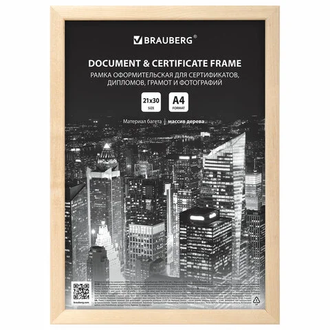Рамка 21х30 см, дерево, багет 20 мм, BRAUBERG 'Business', светлое дерево, акриловый экран, 391291