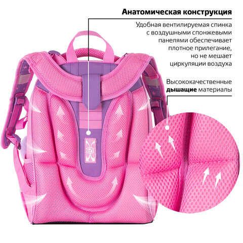 Удобная мягкая вентилируемая спинка с воздушными спонжевыми панелями разработана с учетом анатомических особенностей детей младшего школьного возраста. При правильной регулировке ранец будет практически не ощущаться на плечах и не будет доставлять дискомфорт при носке. В процессе эксплуатации равномерное распределение нагрузки позволит сохранить правильную осанку!