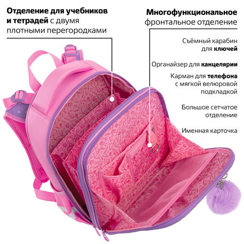 В основном отделении ранца можно легко и быстро разместить учебники и тетради между двумя плотными перегородками. Внутри фронтального отделения находится органайзер для канцтоваров, карман для телефона, съёмный карабин для ключей и большое отделение из сетки. Такая организация пространства поможет держать принадлежности в сохранности и приучить ребенка к порядку. Ранец широко раскрывается, повышая удобство использования, а за счёт боковых перегородок содержимое не выскользнет из ранца.