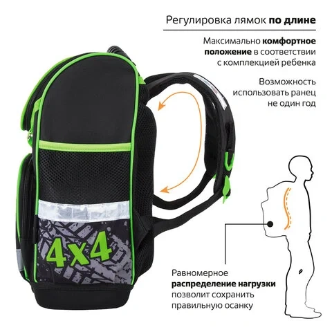 Оптимальный размер ранца, мягкие регулируемые по длине лямки и вес 850 грамм полностью удовлетворяют потребности ученика начальной школы. Светоотражающие элементы со всех сторон ранца обеспечивают безопасность на дороге в темное время суток.