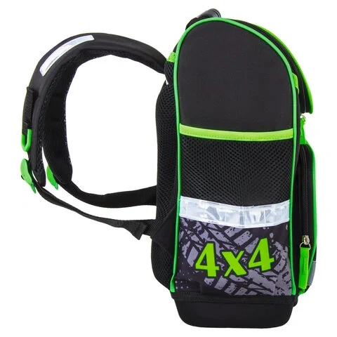 Жесткокаркасный ранец выполнен из прочного износостойкого полиэстера. Ранец состоит из одного просторного отделения, 1 переднего и 2 боковых карманов.