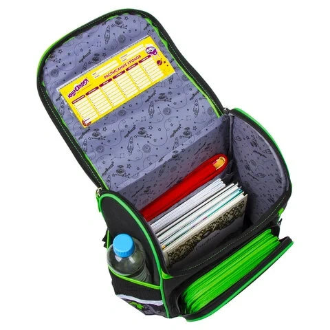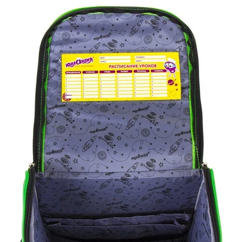 Внутренние разделители для книг и тетрадей в основном отделении позволяют правильно организовать пространство в ранце. Еще одна удобная опция - вкладыш для заполнения расписания уроков и контактной информации школьника на внутренней стенке крышки ранца.