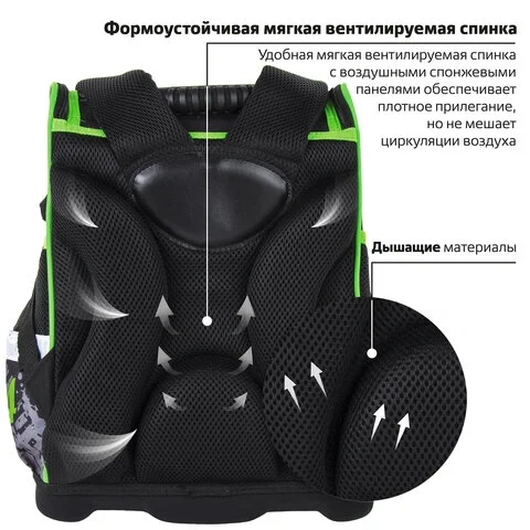 Уплотненное рельефное дно из эргономичного материала EVA сохраняет устойчивость, жесткость и функциональность ранца, при этом не утяжеляя его. Рельефная структура материала позволяет сохранить устойчивость даже на неровной поверхности.