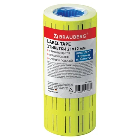 Этикет-лента 21х12 мм прямоугольная, желтая, с черной полосой, КОМПЛЕКТ 5 рулонов по 600 штук, BRAUB