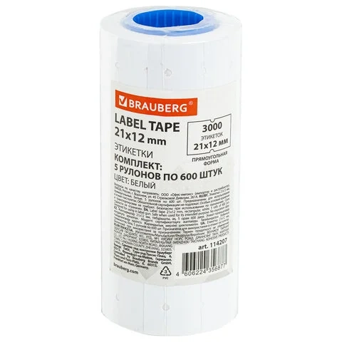 Этикет-лента 21х12 мм прямоугольная, белая, КОМПЛЕКТ 5 рулонов по 600 шт., BRAUBERG, 114207