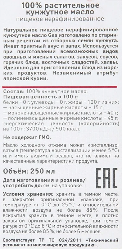 Масло кунжутное Gea нерафинированное, 250мл