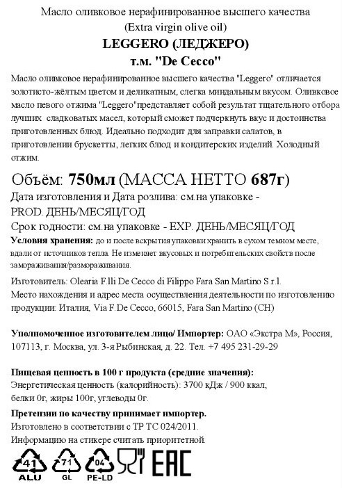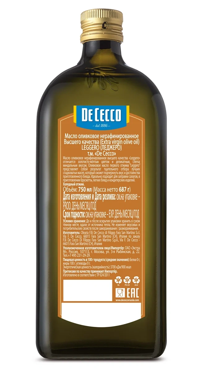 Масло оливковое De Cecco Leggero Extra Vergine нерафинированное, 750мл