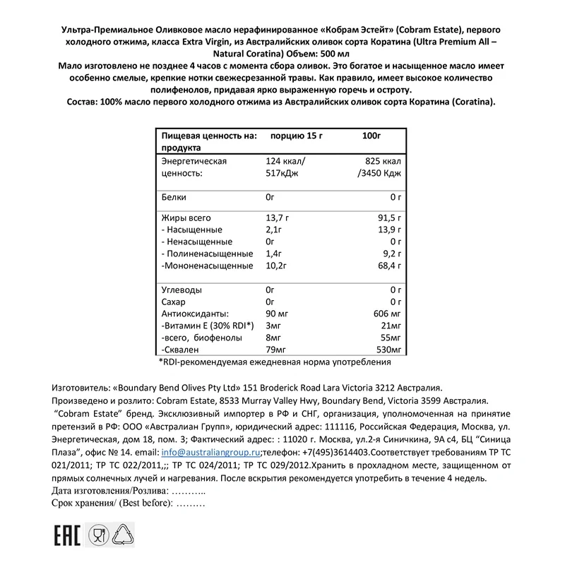 Масло оливковое Cobram Estate Coratina Extra Virgin нерафинированное, 500мл