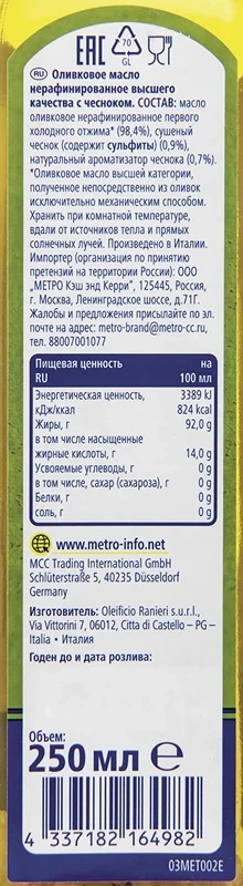 METRO Chef Масло оливковое с чесноком Extra Virgin нерафинированное, 250мл