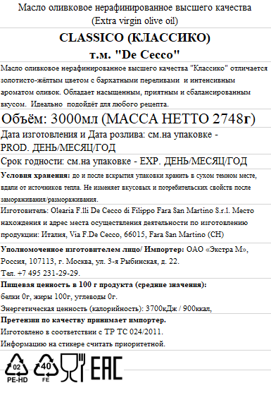 Масло оливковое De Cecco Classico нерафинированное, 3л
