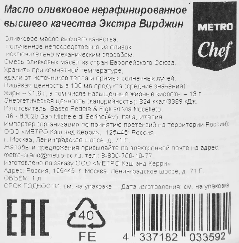 METRO Chef Масло оливковое Extra Virgin нерафинированное, 1л