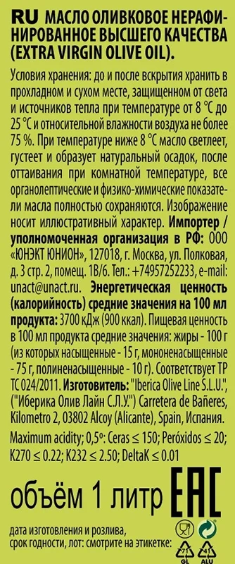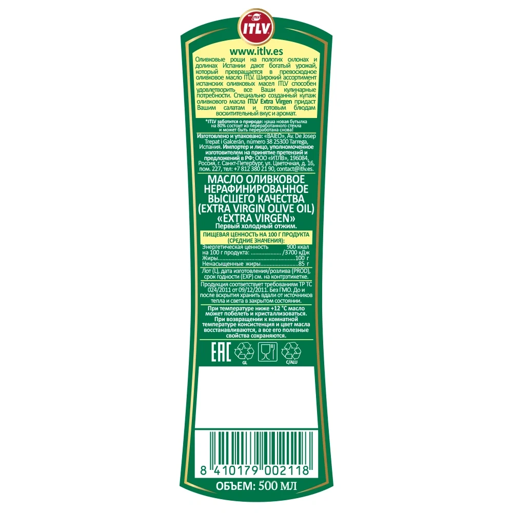 Масло оливковое ITLV Extra Virgen нерафинированное, 500мл