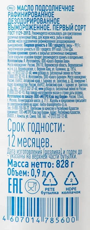 aro Масло подсолнечное рафинированное дезодорированное, 900мл