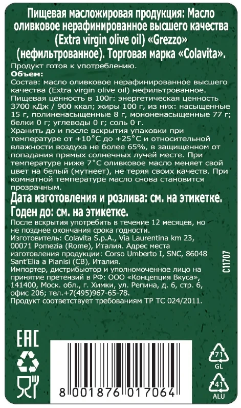 Масло оливковое Colavita Grezzo Extra Virgin нерафинированное, 500мл
