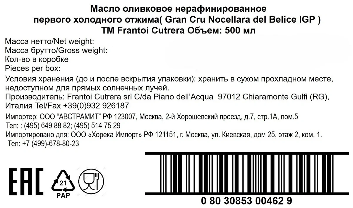 Масло оливковое Frantoi Cutrera Nocellara Extra Vergin, 500мл