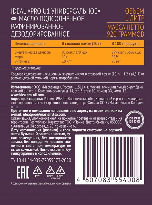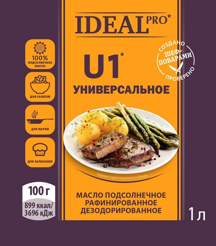Масло подсолнечное Ideal Pro U1 Универсальное рафинированное дезодорированное, 1л