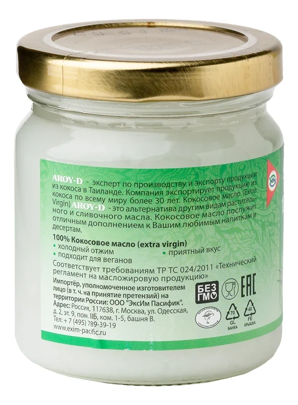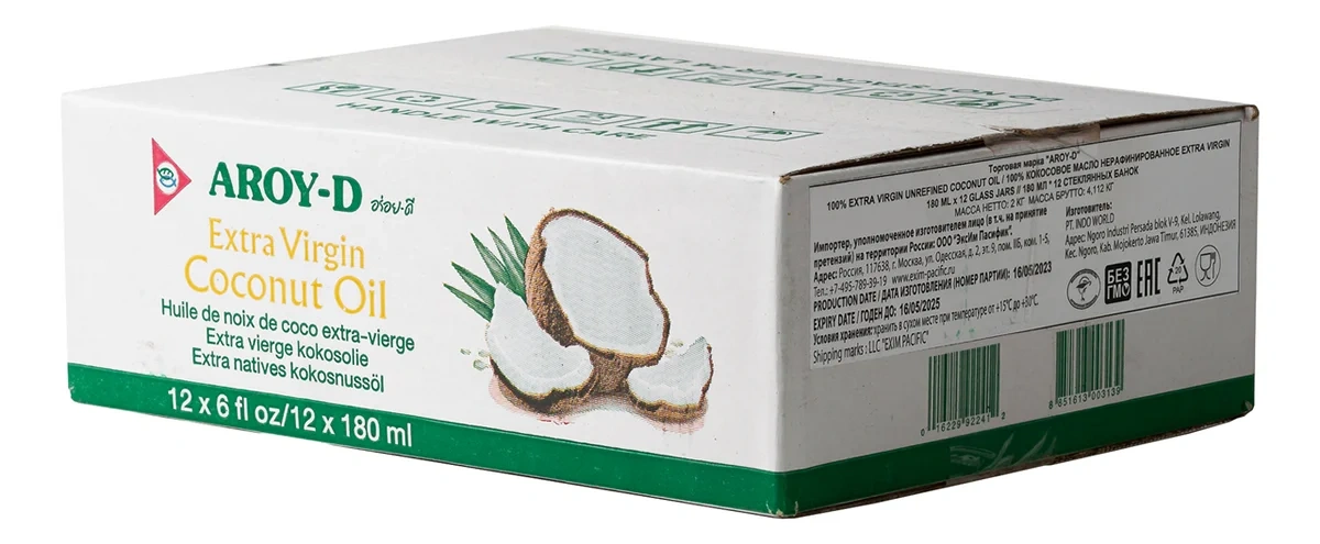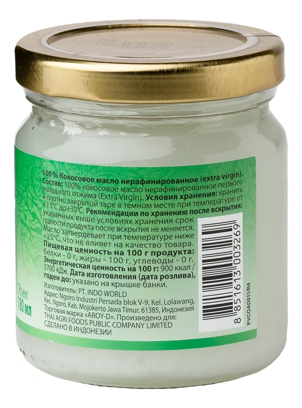 Масло кокосовое Aroy-D Extra Virgin нерафинированное, 180мл