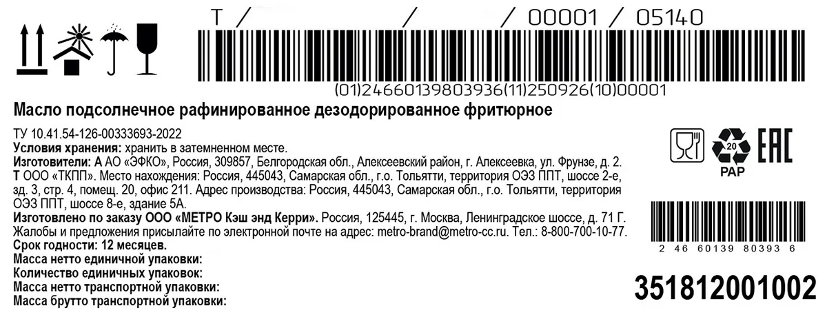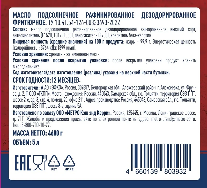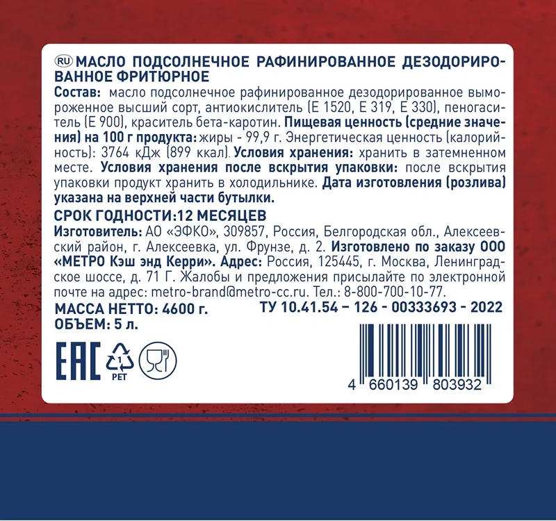 METRO Chef Масло подсолнечное Для фритюра рафинированное дезодорированное, 5л