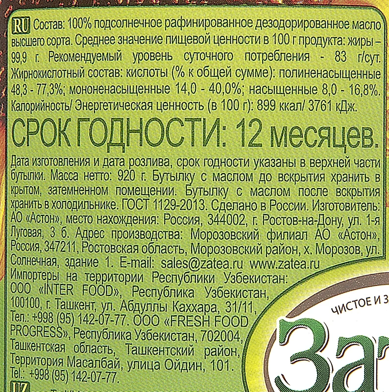 Масло подсолнечное Затея рафинированное дезодорированное, 1л