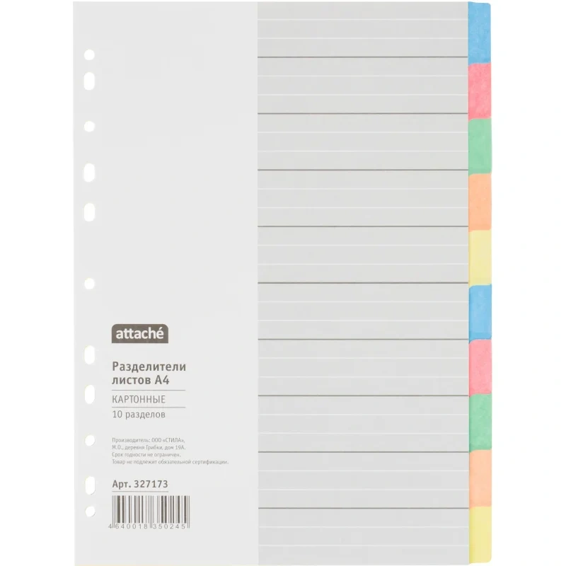 Разделители листов Attache формата А4 изготовлены из прочного картона. Размер — 297×210 мм. Плотность листов — 150 г/кв.м. Универсальная перфорация совместима с различными типами папок. В комплекте 10 цветных разделителей листов, а также титульный лист для удобства и быстроты поиска.