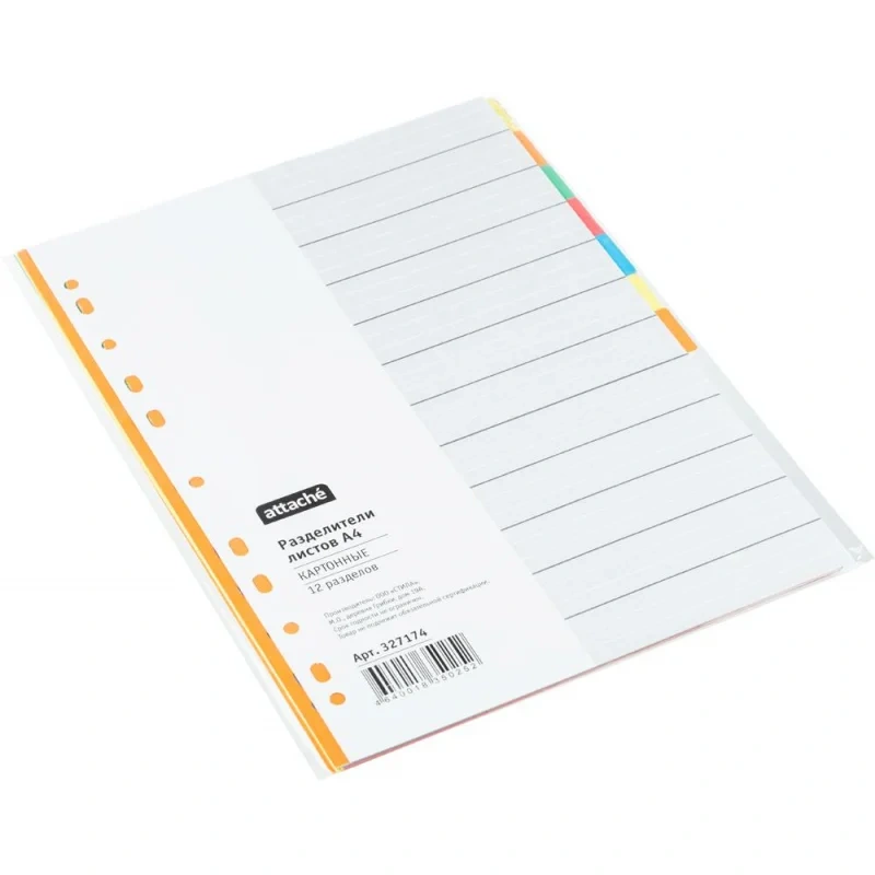 Разделители листов Attache формата А4 изготовлены из прочного картона. Размер — 297×210 мм. Плотность листов — 150 г/кв.м. Универсальная перфорация совместима с различными типами папок. В комплекте 12 цветных разделителей листов, а также титульный лист для удобства и быстроты поиска.