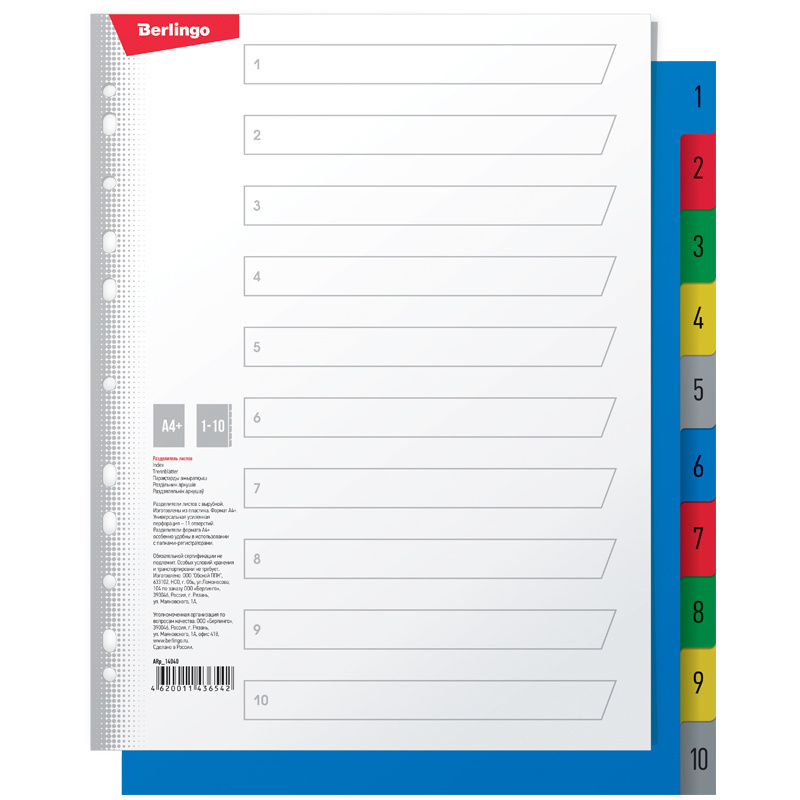 Разделители пластиковые, формат А4+. Обеспечивают сохранность и аккуратность листов. Удобны в использовании с папками-регистраторами. Индивидуальная упаковка в плёнку, затем в гофрокороб.