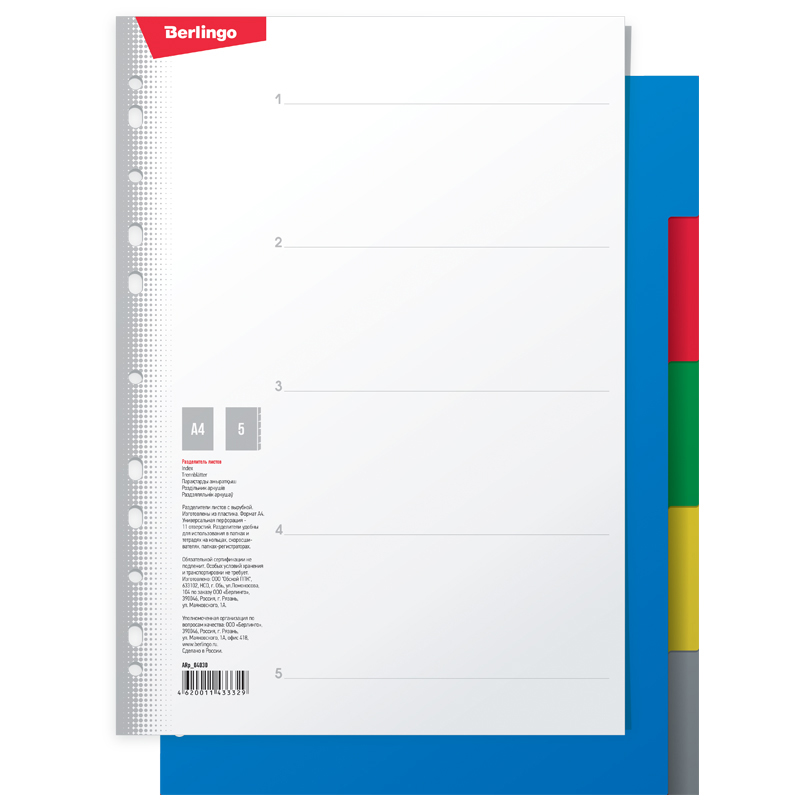 Набор цветовых разделителей. Формат А4. Обеспечивают сохранность и аккуратность листов. Удобны в использовании с папками-регистраторами и на кольцах.