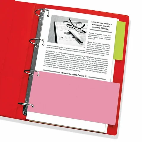 Изготовлены из качественного картона плотностью 160 г/м2. В комплект входят 100 листов размером 230х105 мм синего, красного, зеленого и желтого цвета, обеспечивающих возможность сортировки документов по цветам. Универсальная перфорация позволяет подшивать разделители во все типы папок.