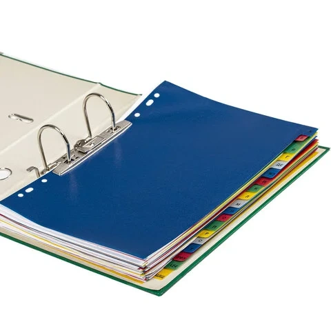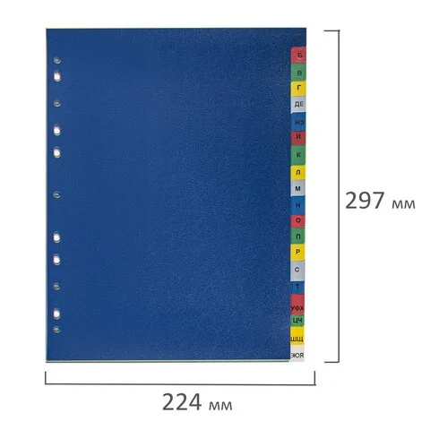 Изготовлены из пластика толщиной 0,12 мм. В комплект входят 20 листов синего, красного, серого, зеленого и желтого цвета, обеспечивающих возможность сортировки документов по алфавиту, а также титульный лист для оглавления. Универсальная перфорация позволяет подшивать разделители во все типы папок. Размер - 224х297 мм.
