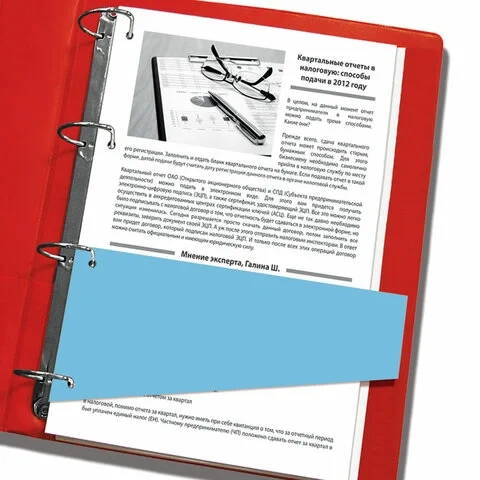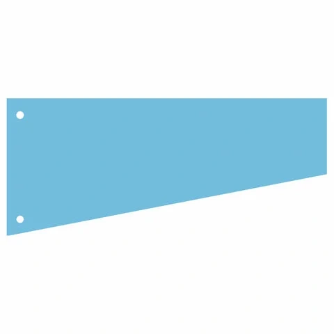 Изготовлены из качественного картона плотностью 160 г/м2. В комплект входят 100 листов трапецевидной формы размером 230х120 мм синего цвета. Универсальная перфорация позволяет подшивать разделители во все типы папок.