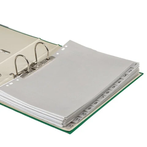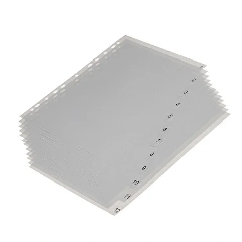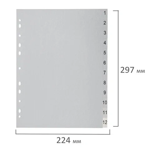 Изготовлены из пластика толщиной 0,12 мм. В комплект входят 12 листов серого цвета, обеспечивающих возможность сортировки документов по цифрам, а также титульный лист для оглавления. Универсальная перфорация позволяет подшивать разделители во все типы папок. Размер - 224х297 мм.