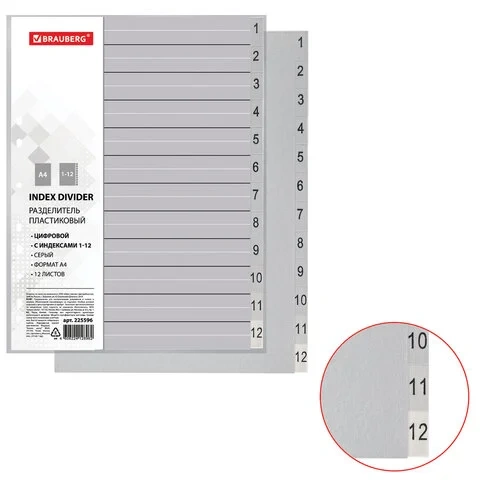 Разделитель листов Brauberg серые, 12 разделов, А4, по цифрам 1-12, с оглавлением