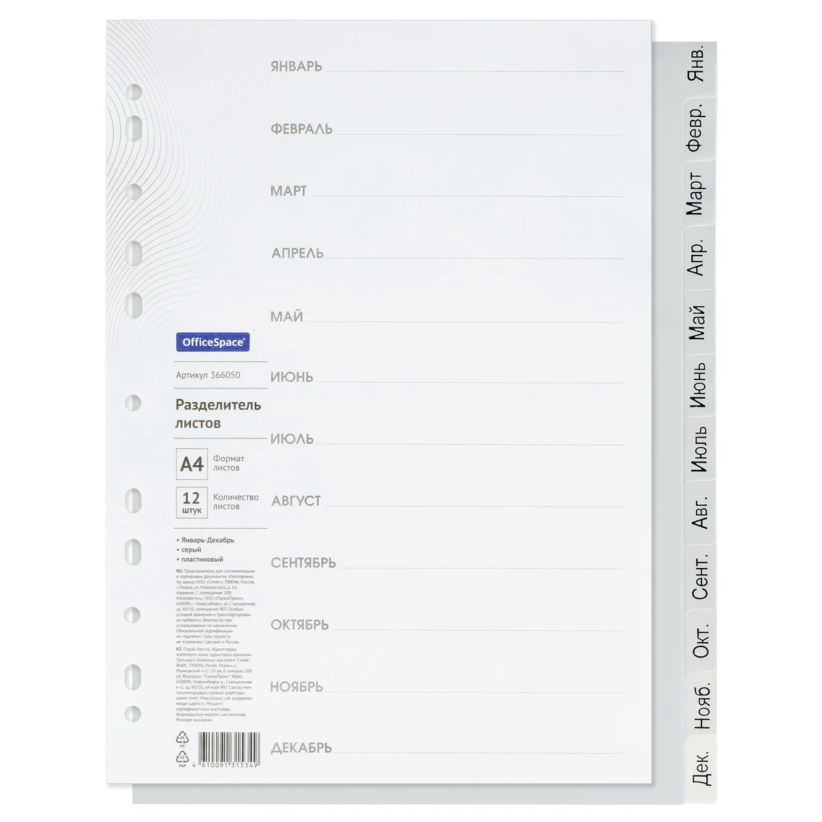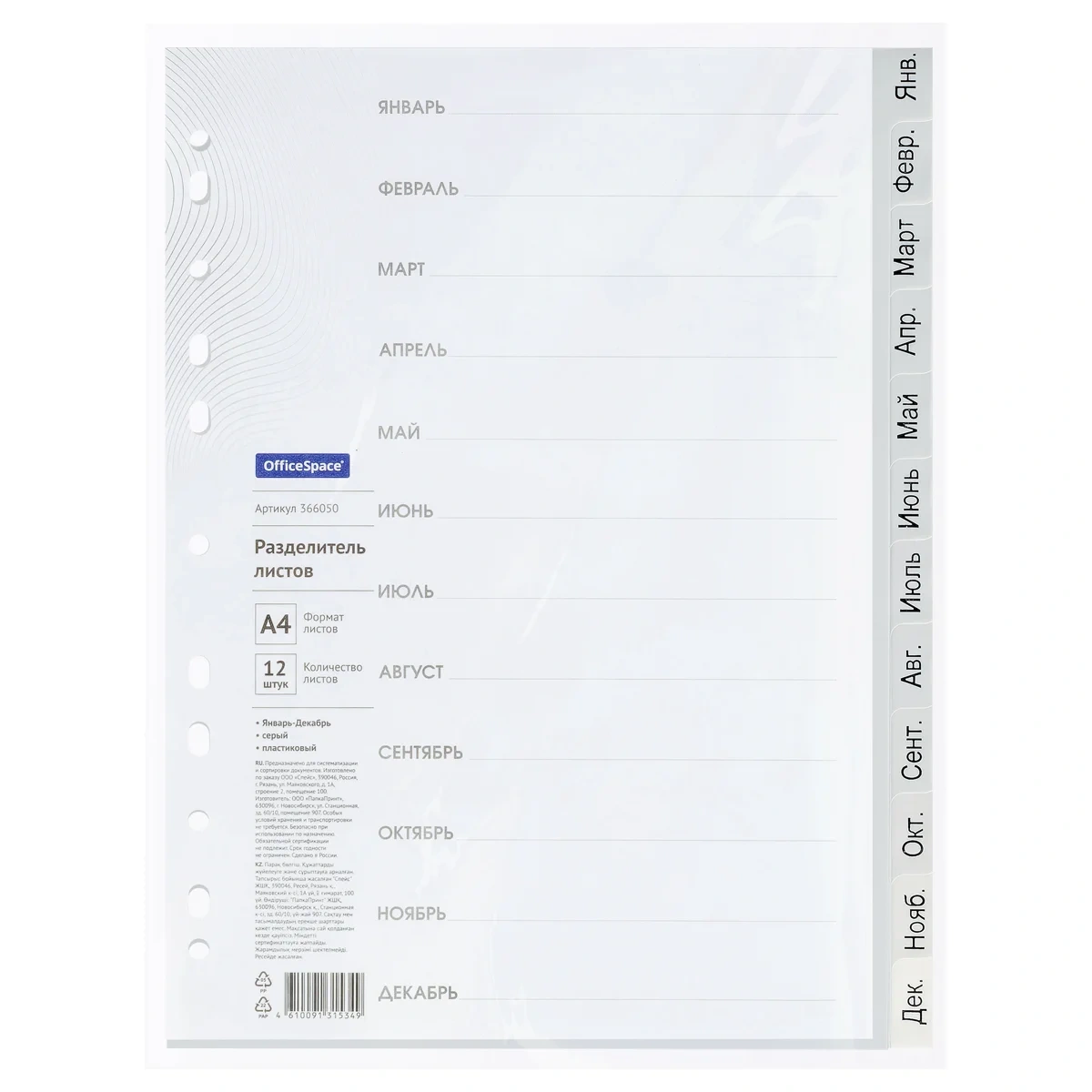 Разделитель листов OfficeSpace А4, 12 листов, Январь-Декабрь, серый, пластиковый