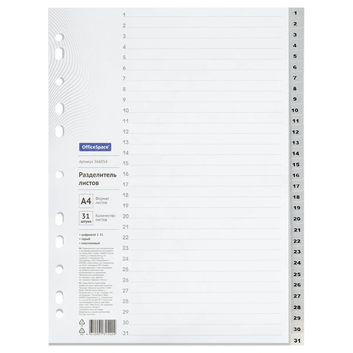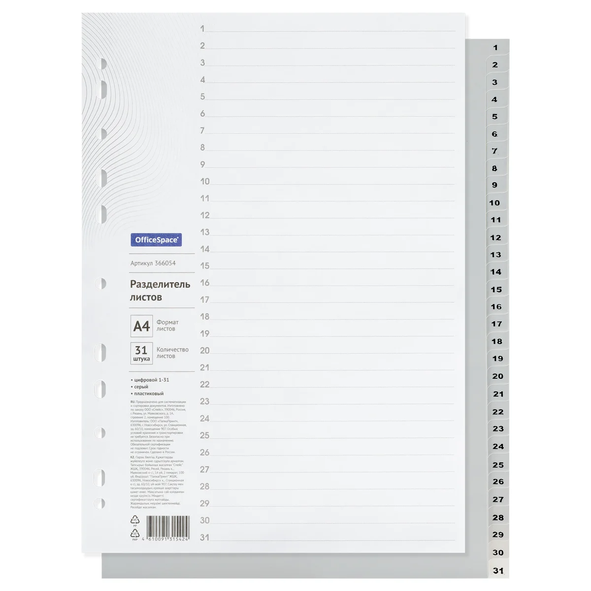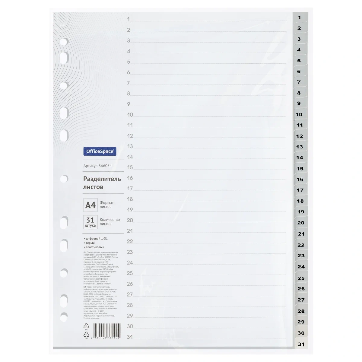 Разделитель листов OfficeSpace А4, 31 лист, цифровой 1-31, серый, пластиковый