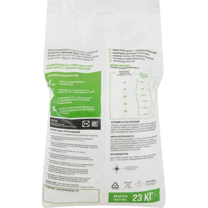 Многокомпонентный противогололедный материал, идеально подходит для обработки территорий загородных коттеджных поселков, территорий загородных домов с твердым покрытием. Производство Bionord Green осуществляется по передовой технологии ’Единая гранула’. ПГМ позволяет в короткие сроки нейтрализовать зимнюю скользкость либо предупредить ее, не наносит ущерб окружающей среде, изделиям из кожи и меха за счет введения в состав биофильной добавки — карбамида.