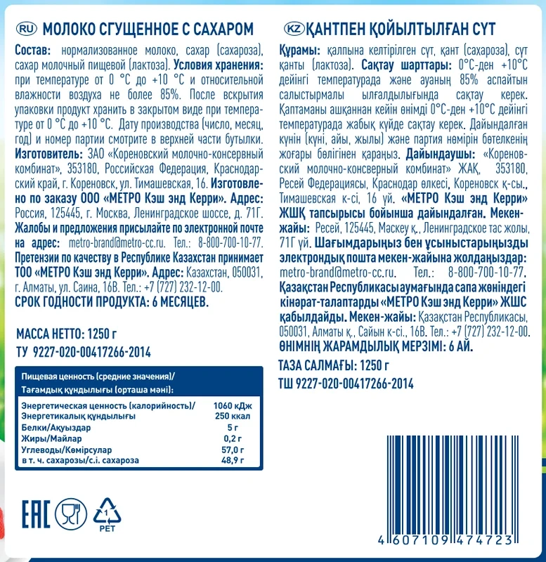 Молоко сгущеное Metro Chef 8,5% Гост, 380г БЗМЖ изготовлено в соответствии с ГОСТом из цельного коро...