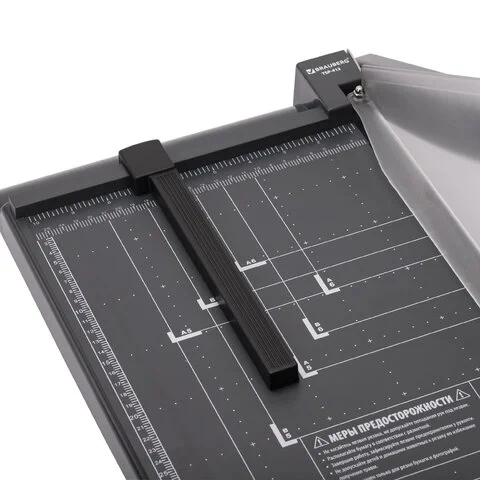Оснащен безопасным лезвием, регулируемым пластиковым упором и прижимом для бумаг. Рукоятка анатомической формы препятствует соскальзыванию руки, а специальное крепление для рукояти зафиксирует её в закрытом положении и предотвратит непреднамеренное поднятие. Удобная разметка рабочей поверхности позволяет точно наметить линию реза.