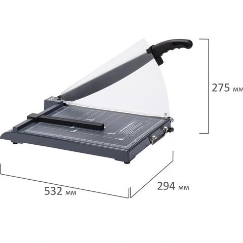 Длина реза составляет 330 мм. Также имеются уголки для форматов А4, B5, А5, B6. Резиновые ножки вкупе с прочным основанием предотвращают скольжение по рабочему столу во время эксплуатации. Размер – 275х294х532 мм. Вес – 1,4 кг.