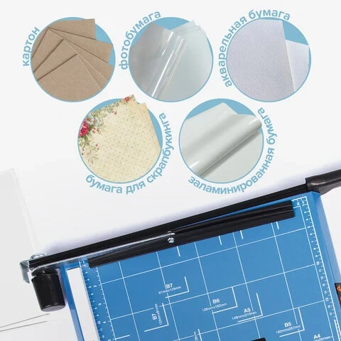 Оснащен безопасным лезвием, регулируемым упором и автоматическим прижимом для бумаг. Рукоятка анатомической формы препятствует соскальзыванию руки. Прочное металлическое основание. Удобная разметка рабочей поверхности и регулируемый упор позволяют точно наметить линию реза. Длина реза составляет 300 мм. Также имеются уголки для форматов А4, B5, А5, B6, B7. Резиновые ножки предотвращают скольжение по рабочей поверхности во время эксплуатации. Размер - 63х280х510 мм. Вес - 2.6 кг.