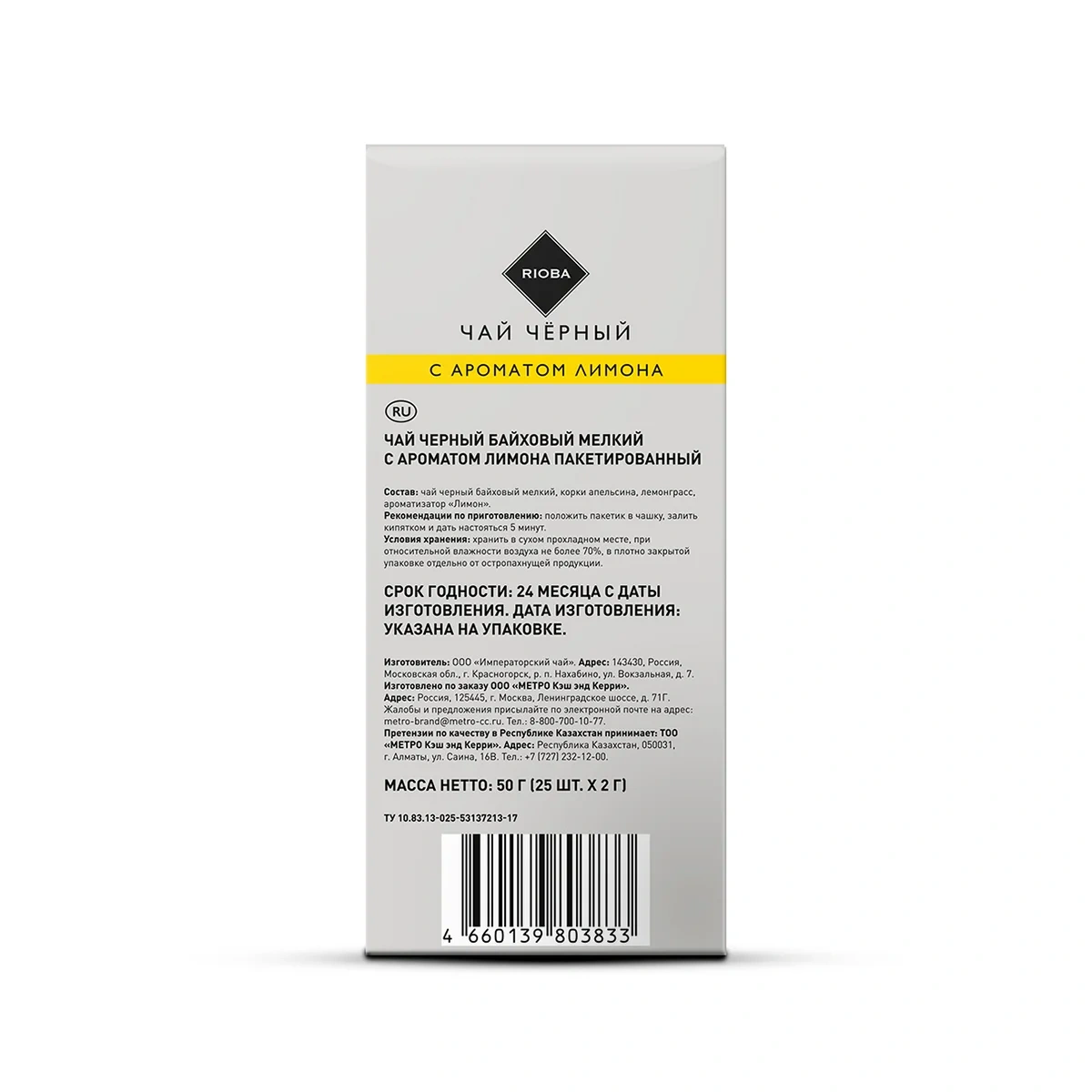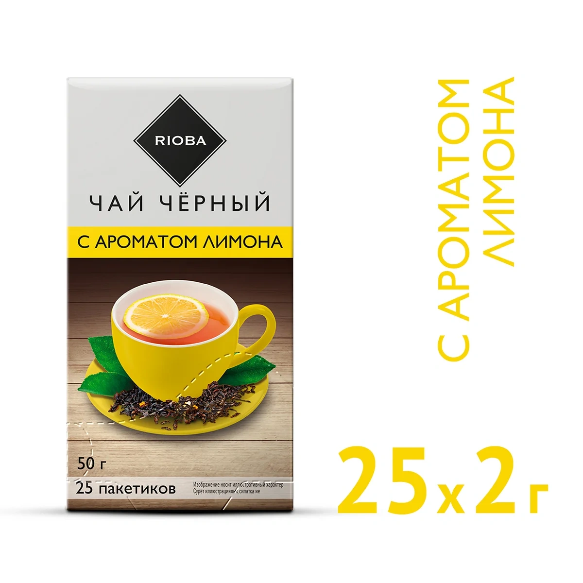 Rioba Чай черный с ароматом лимона (2г x 25шт), 50г это невероятный по вкусу купаж черного пакетированного чая и свежего лимона в яркой упаковке. Вкусный тонизирующий чай со свежими цитрусовыми нотами подарит хорошее настроение и превратит чаепитие в праздник. Чай черный байховый с ароматом лимона освежает и согревает, может употребляться в горячем и холодном виде.