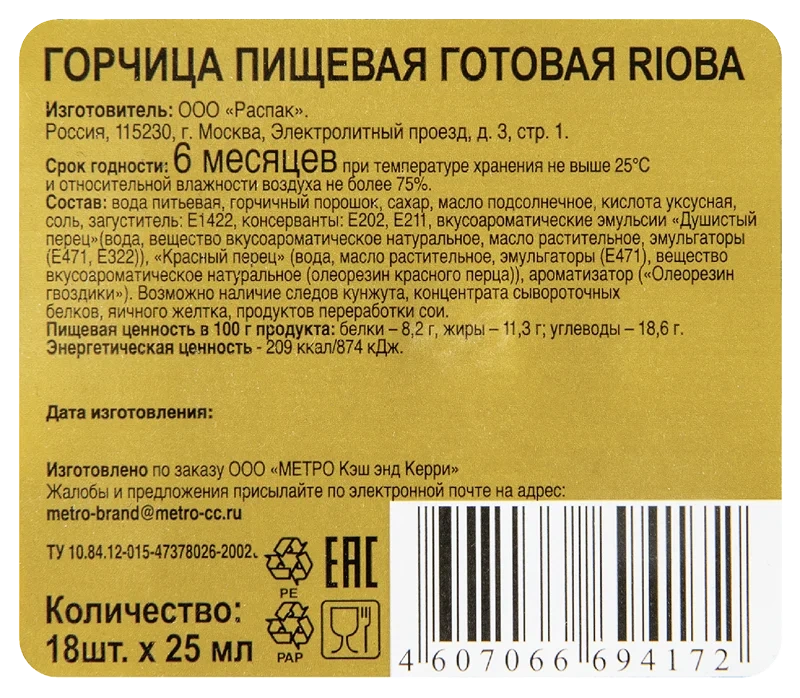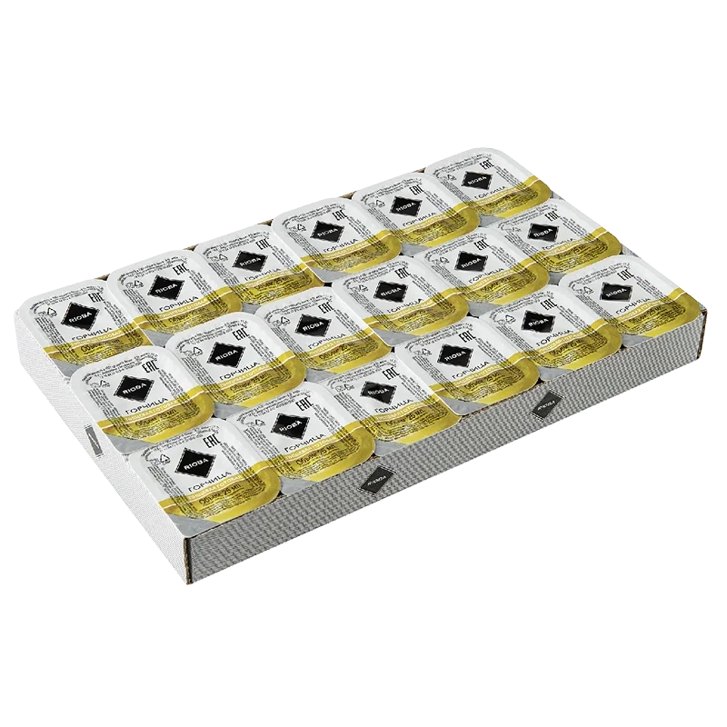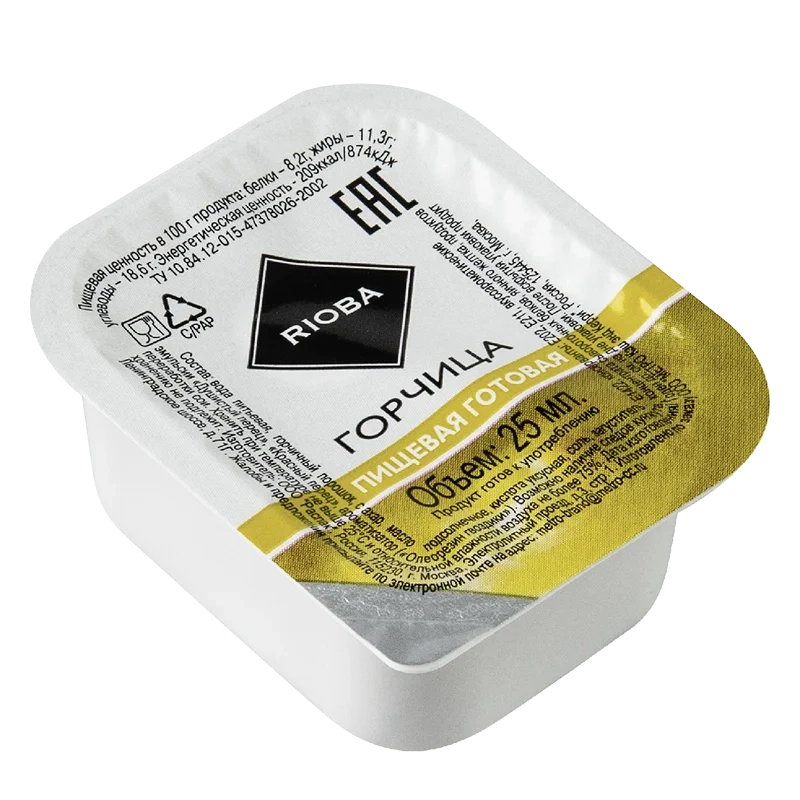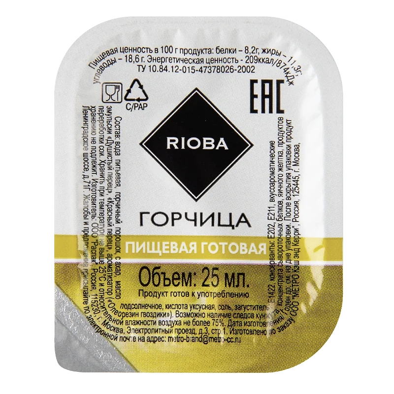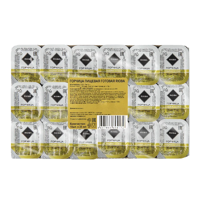 Горчица Rioba, 18х25г добавит нотку пикантности блюдам из мяса, овощей, морепродуктов, рыбы и птицы, а также станет прекрасным вариантом для хот-догов. Продукт также может стать основой для создания изысканных соусов к различным блюдам. Горчица благотворно воздействует на процесс обмена веществ и ускоряет сжигание жиров. Может выступать в роли вспомогательного средства при лечении простудных заболеваний. Продукт является прекрасной профилактикой сердечно-сосудистой системы.