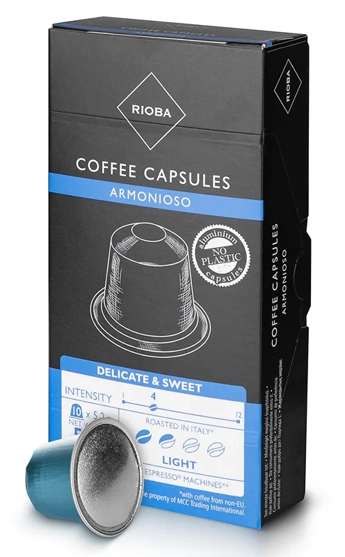 RIOBA Armonioso капсулы для кофемашин Nespresso, 10x5г созданы специально для приготовления ароматного напитка с глубоким вкусом. Для них использованы зерна 100 % арабики. Идеально подходят для любителей некрепких кофейных напитков, предпочитающих нежный и утонченный вкус без резкости.