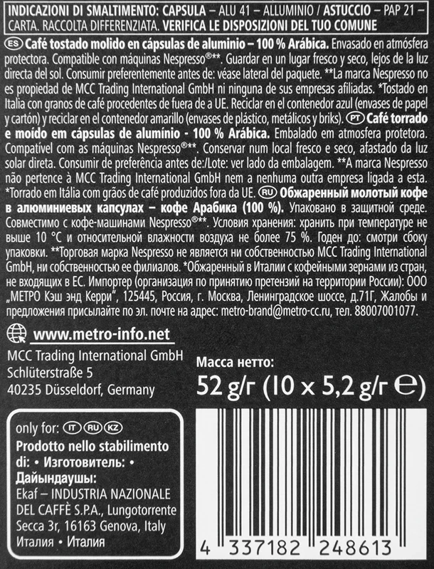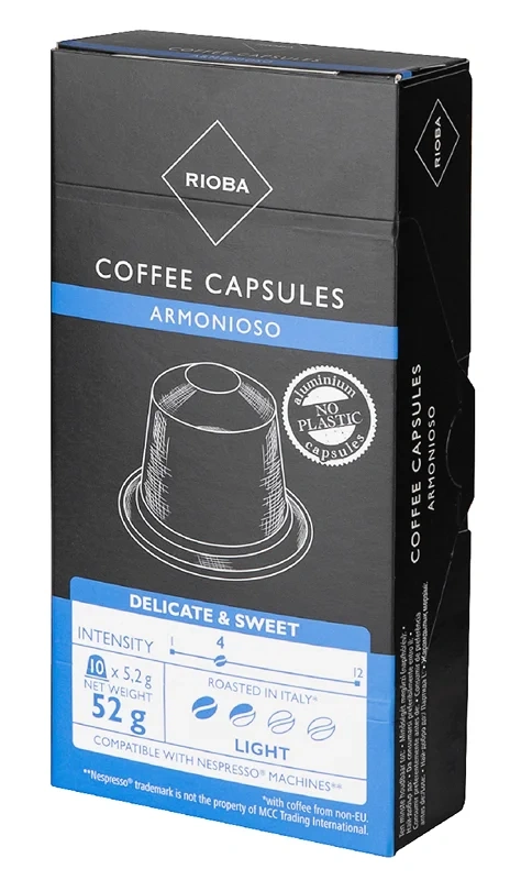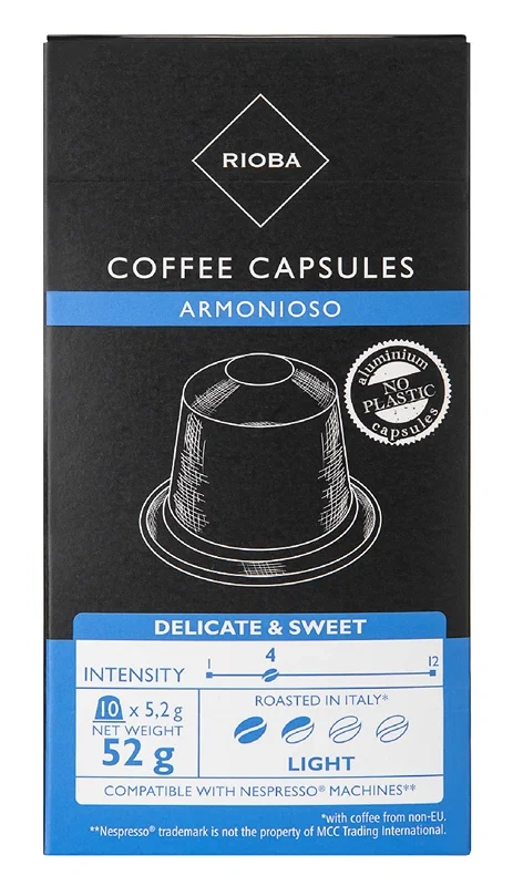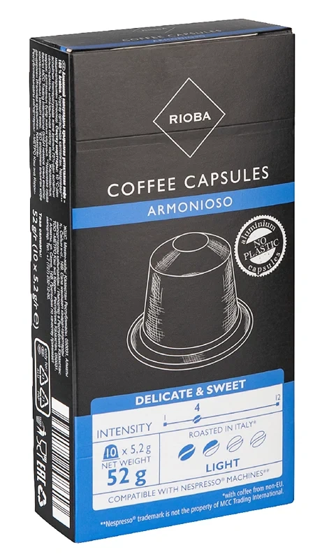 RIOBA Delicato капсулы для кофемашин Nespresso, 10x5 г обладают очень нежным, но в то же время выраженным вкусом, который будет хорошим и бодрящим началом каждого дня. Напиток, придающий энергии, очень легко создать на основе тщательно отобранных зерен 100 % арабики, рекомендуются любителям крепкого и выразительного кофе, предпочитающим классическое сочетание силы и гармонии.