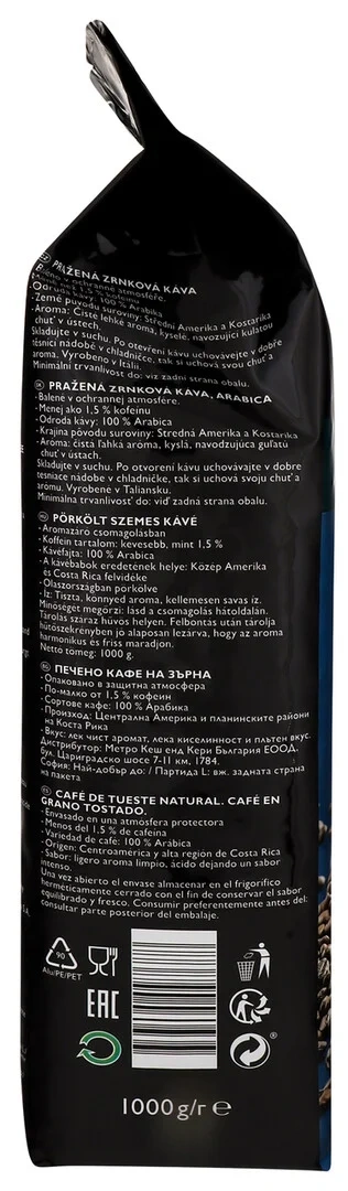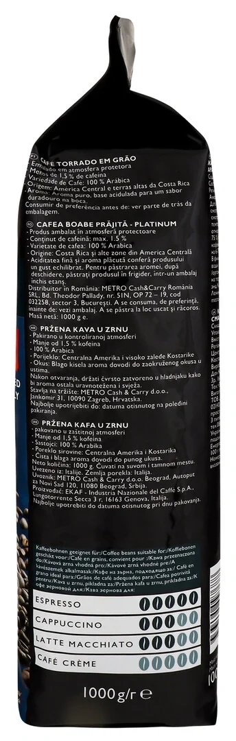 Rioba Platinum – 100% отборной арабики для ценителей кофе. Требует особого мастерства бариста при приготовлении, но при правильной работе дает изысканный элегантный вкус. Упаковка кофе Rioba полностью соответствуют требованиям ресторанного бизнеса: пакет весом 1 кг помогает оптимизировать заказы, а удобный дегазирующий клапан служит для быстрого и эффективного удаления накопленного внутри упаковки газа СО2. Кроме того он надежно изолирует содержимое от внешнего кислорода, влажности и загрязнения, а также позволяет насладиться ароматом кофе еще до покупки, одновременно удерживая попадание воздуха внутрь упаковки. А привлекательная цена позволит снизить издержки без потери качества. Для обжарки кофе Rioba используется традиционный метод медленной обжарки с помощью газовых обжарочных машин. Каждый ростер вмещает около 360 кг кофе, что позволяет добиться стабильного вкуса и качества. Кофе Rioba обжаривается при 210-220 градусах 12-15 минут. Зерновой кофе пакуется в течение 10 часов после обжарки.