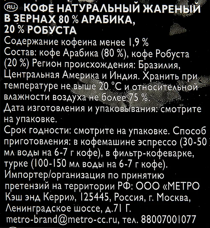Кофе зерновой Rioba Gold 80% arabica 20% robusta, 1000г – это натуральные свежеобжаренные зерна, вкус и аромат которых полностью передаются готовому напитку. Смесь кофейных зерен состоит на 80% из отборной арабики и на 20% из качественной робусты. Сочетание этих сортов в данной пропорции придает мягкость и деликатность напитку. После помола кофе готовится в кофемашине или турке. Вкус и аромат раскроются ярче, если добавить в напиток немного тростникового сахара. Герметичная вакуумная упаковка, в которую зерна помещаются сразу после обжарки, надолго сохраняет их уникальные свойства.