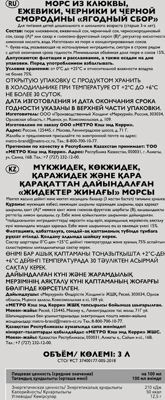 Rioba Морс ягодный сбор, 3л хорошо утоляет жажду. Он насыщает организм витаминами и минералами, повышает иммунитет, сопротивляемость негативным последствиям стрессовых ситуаций. Морс хорошо сочетается с различными блюдами, свежеиспеченным хлебом. Благодаря низкой калорийности напиток могут употреблять люди, которые придерживаются принципов правильного питания. Морс приготовлен из натуральных ингредиентов. Его состав позволяет сохранить в напитке максимум полезных веществ, что делает его отличным дополнением к повседневному рациону как взрослых, так и детей. Следует избегать попадания прямых солнечных лучей тару, чтобы избежать преждевременной порчи продукта.RIOBA является эксклюзивным брендом, рассчитанным на бары, кафе и отели. Ассортимент включает все, что нужно для представителей бизнеса: от приготовления оригинальных коктейлей и свежего кофе до сервировки. В каталоге бренда можно найти широкий выбор кондитерских изделий и напитков, бакалею, молочную продукцию, материалы и посуды для кафе и многое другое. Вся продукция поставляется в удобных и эстетичных упаковках, которые полностью соответствуют потребностям сегмента HoReCa.Асептическая упаковка с краном, который не пропускает при его использовании кислород внутрь, что позволяетсохранять открытый морс 30 суток в холодильнике - это очень удобно для использования продукта с большим литражом.