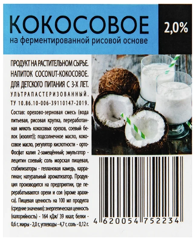 Орехово-зерновая смесь (вода питьевая, рисовая крупка, переработанная мякоть кокосовых орехов, соевый белок), подсолнечное масло, кокосовое масло, регулятор кислотности – фосфат калия; эмульгатор – лецитин соевый, источник кальция – карбонат кальция, стабилизатор – геллановая камедь, каррагинан; соль морская пищевая, натуральный ароматизатор, витамины (В6, В12).