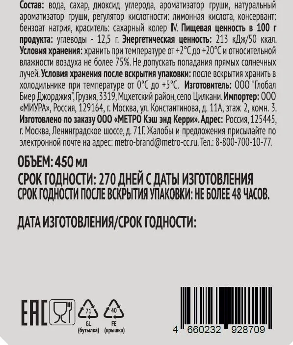 Изготовлен по традиционной технологии на основе натурального грушевого сока. Напиток приготовлен на основе чистейшей артезианской воды и прекрасно утоляет жажду.
